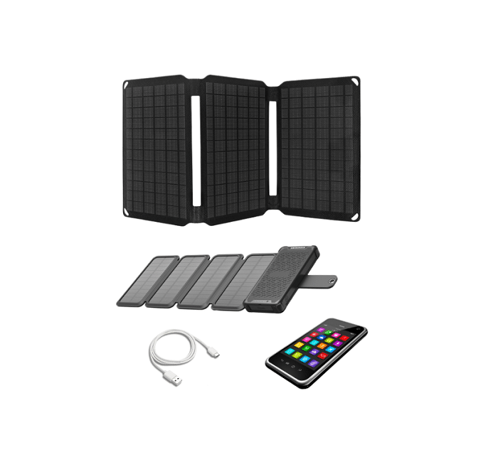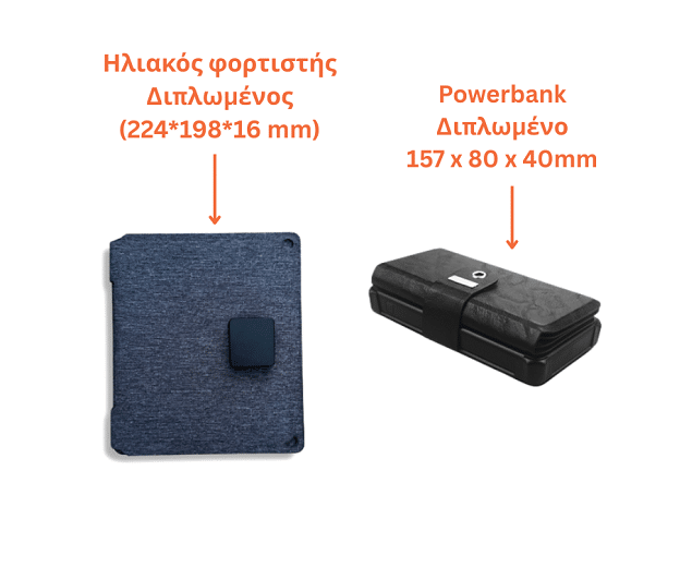 Το ηλιακό κιτ συμπεριλαμβάνει: 1 αναδιπλούμενο φωτοβολταϊκό συλλέκτη 15W, 1 μπαταρία λιθίου (powerbank) 10000mAh, 1 σετ καραμπινέρ και 1 καλώδιο με βύσματα USB & USB C.